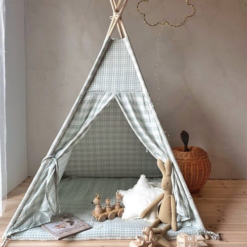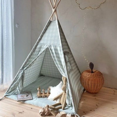 Namiot tipi dla dzieci z matą podłogową z dwustronnego muślinu miętowy w kratkę