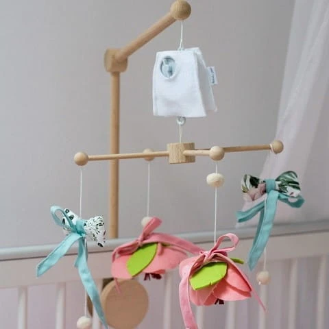 Karuzela "Peonia" została wykonana z wysokogatunkowego drewna. Posiada obrotową pozytywkę ukrytą pod “kapturkiem” z filcu. Po nakręceniu zabawki delikatnie się obracają.