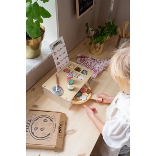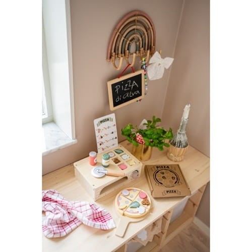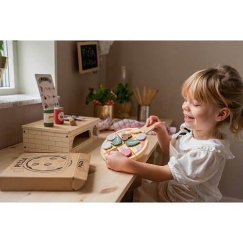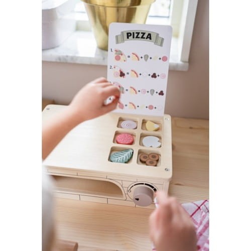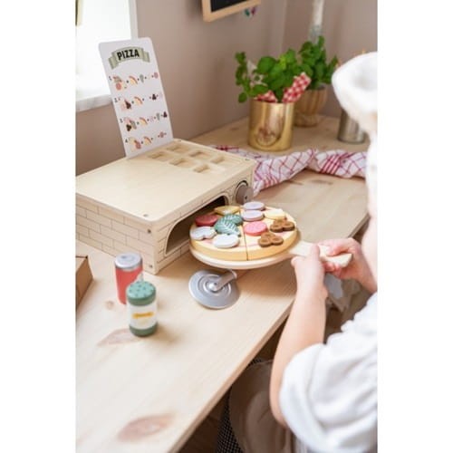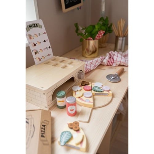 Drewniany piec do wypieku pizzy to element zestawu zabawki, który umożliwia maluchom „pieczenie”. Kawałki ciasta połączone są rzepami, co sprawia, że krojenie i tworzenie pizzy przypomina prawdziwą zabawę w kuchni. Zestaw zawiera także akcesoria, które pozwalają na przygotowanie pizzy według własnego pomysłu lub zgodnie z kartą zamówienia. Wraz z dodatkowymi składnikami, takimi jak pieczarki, salami, cebula, ananas, oliwki czy ser parmezan, dziecko może eksperymentować i komponować różne wersje pizzy, tworząc menu, które będzie różnorodne i smakowite.