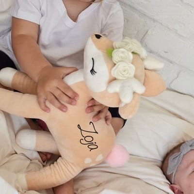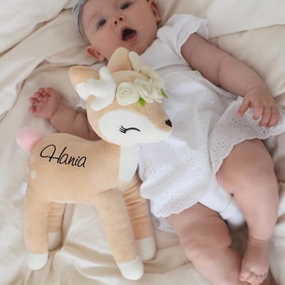 Urocza i słodka, pluszowa sarenka z kremowymi kwiatuszkami w formie wianuszka na główce i z milutkim ogonkiem to idealna przytulanka dla małej dziewczynki w każdym wieku. W wersji spersonalizowanej - z imieniem dziecka.
