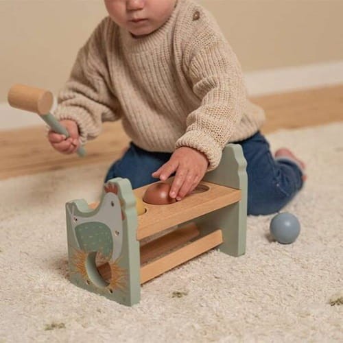 Przebijanka Little Farm FSC od Little Dutch. Ta zabawka stymuluje koordynację ręka-oko i doskonale rozwija umiejętności motoryki małej. Spraw, aby kura zniosła kolorowe jajka uderzając młotkiem w 3 kulki w drewnianej podstawie przebijanki.