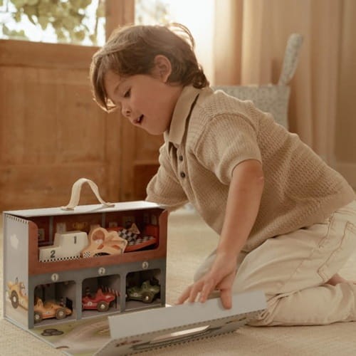 Przenośny tor wyścigowy w walizeczce od Little Dutch. Zestaw zawiera rozkładany, tekturowy tor (gruba tektura), 3 autka wyścigowe, 2 drewniane znaki drogowe, puchar, 5 drewnianych figurek oraz drewniane podium. Zestaw idealny do zabrania ze sobą w podróż, do przedszkola lub wycieczkę. Po wyścigu możesz łatwo schować wszystko z powrotem do walizki.