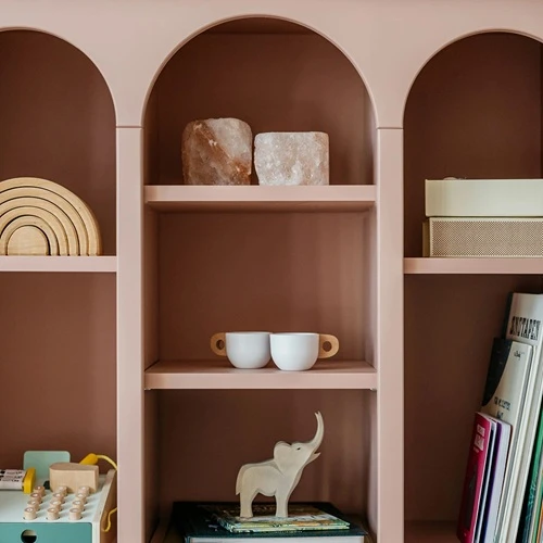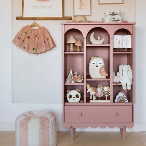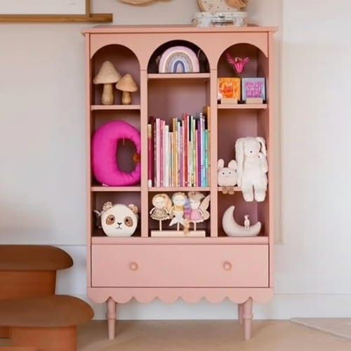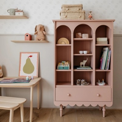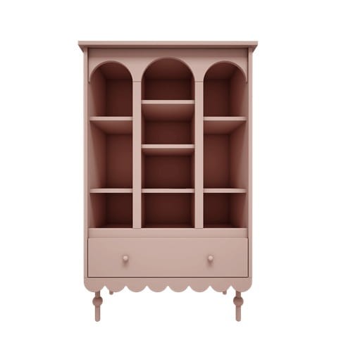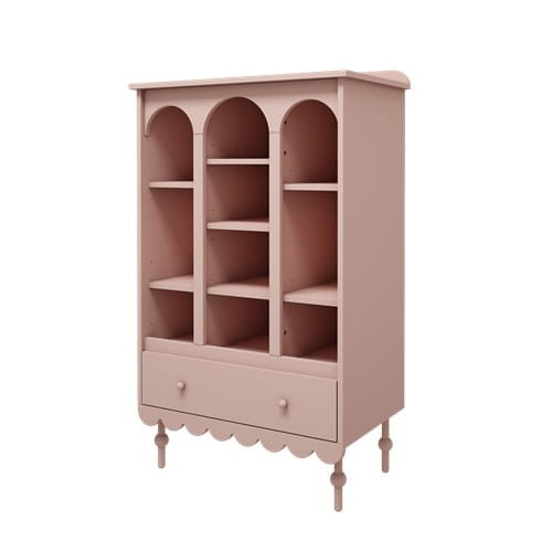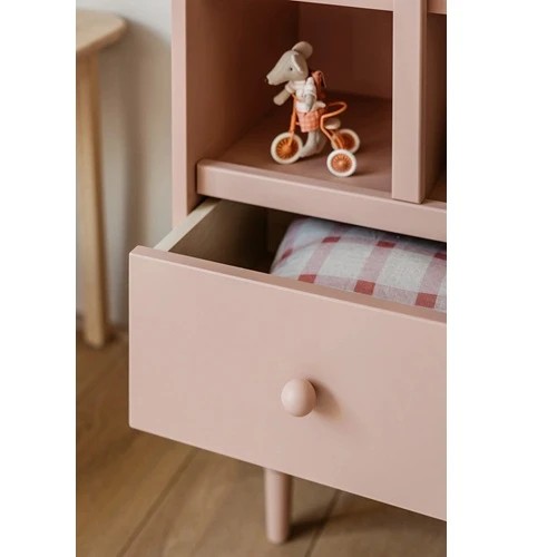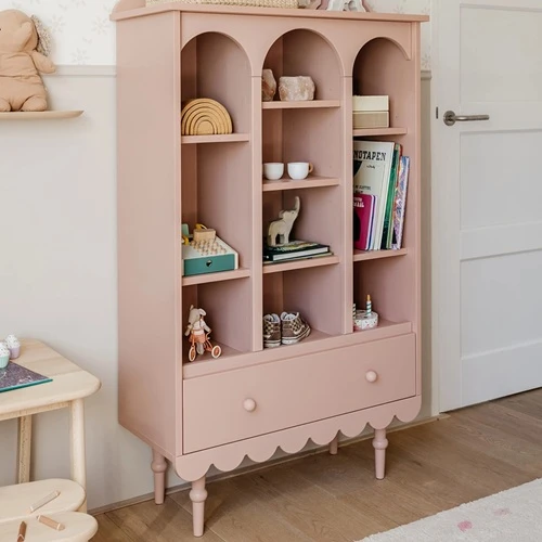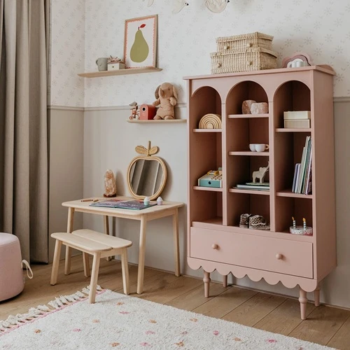 Niezwykle urokliwy regał dziecięcy w stylu retro w kolorze różowym. Idealne miejsce do przechowywania książek, gier, puzzli znajdujących się w pokoju dziecięcym. Regał wyposażony jest w szufladę wyposażoną w prowadnice z samodomykiem. Wyposażony w dużą, pojemną szufladę i wiele półeczek, które będą idealne do przechowywania zabawek czy skarbów dziecka.