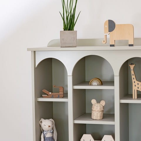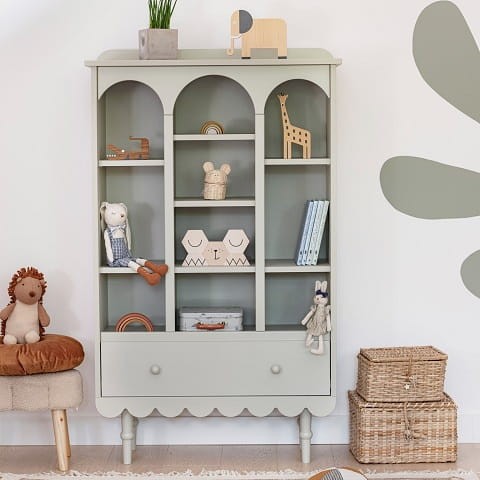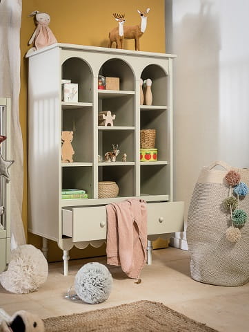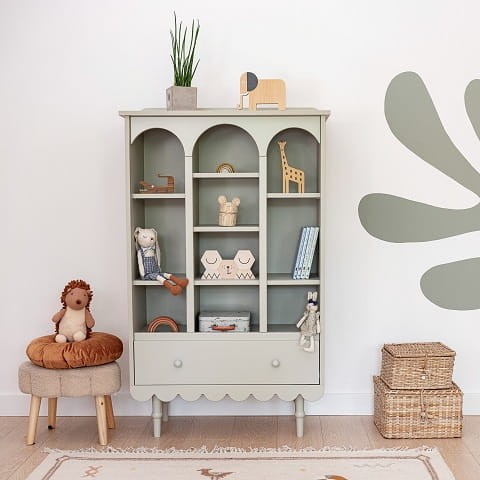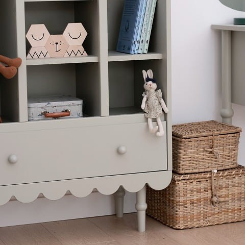 Niezwykle urokliwy regał dziecięcy w stylu retro w kolorze delikatnej oliwki. Idealne miejsce do przechowywania książek, gier, puzzli znajdujących się w pokoju dziecięcym. Regał wyposażony jest w szufladę wyposażoną w prowadnice z samodomykiem.