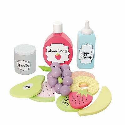 Wspaniały drewniany zestaw do przyrządzania sałatki owocowej, idealne akcesoria kuchenne dla Twojego malucha. W zestawie wszystko to, co potrzebne by przygotować zdrową i przepyszną sałatkę: drewniana miska, drewniane sztućce, bita śmietana, dżem truskawkowy, posypka, kawałek ananasa, banana, truskawki,kiwi, melona, kiść winogron, kawałek pomarańczy. Akcesoria kuchenne marki Jabadabado to idealny dodatek dziecięcej kuchni, inspirujący do kreatywnej, twórczej zabawy. Idealny prezent dla przedszkolaka