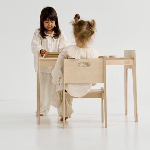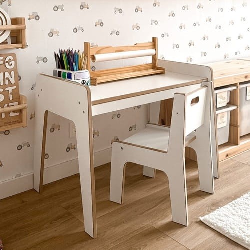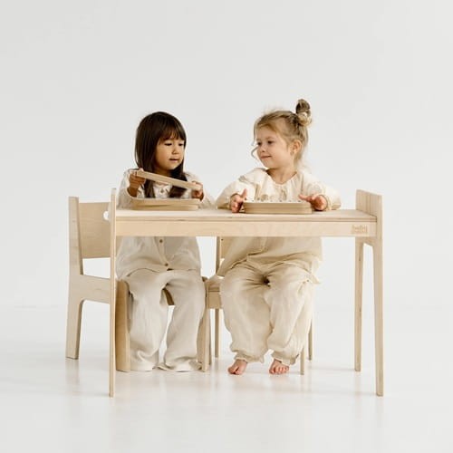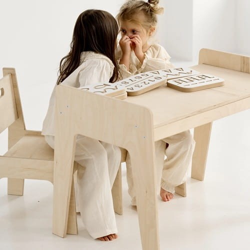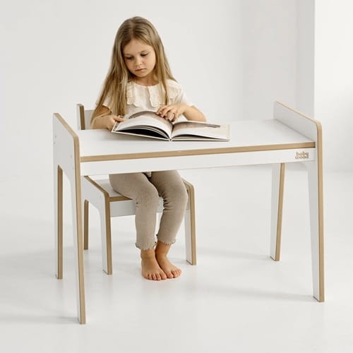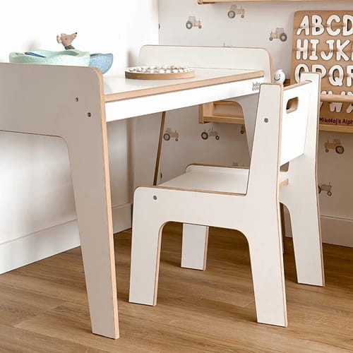 Zestaw mebli montessori, składa się ze stolika, który może pełnić funkcję biurka oraz wygodnego krzeseła w rozmiarze L. Zestaw mebli przyciąga uwagę swoim wyglądem, ale także oferuje wiele zalet korzystania z mebli montessori. Dostępny w czterech różnych kolorach - naturalnym, białym, szarym i czarnym oraz wykonany z wysokiej jakości sklejki brzozowej lub laminowanego MDFu, ten zestaw z pewnością będzie doskonale pasował do każdego wnętrza dziecięcego pokoju.