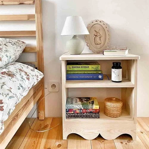 Szafeczka nocna lub mały regał w bardzo sielskim, rustykalnym klimacie. Prosty wzór wzbogacony dekorem przywodzącym na myśl dawne nakastliki.