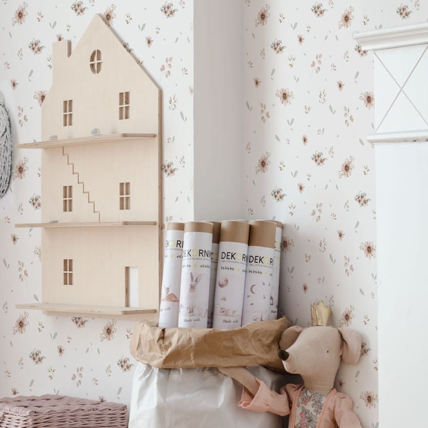 Delikatna tapeta w kwiatki, idealne pasująca do pokoju najmłodszych. To tapeta, która pięknie uzupełnia wystrój, ze względu na pastelowe kolory. Nie przyćmi dekoracji, nie zakłóci harmonii.