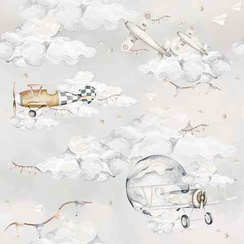 Tyle razy dostawaliśmy wiadomości o zapotrzebowaniu na tapetę z samolotami. I oto jest! Wiecie już, że nie lubimy sztampowych wzorów, dlatego małe latające obiekty na białym tle nas nie interesowały. Interesowało nas stworzenie bajki i to bajki totalnej! Chmury, przestworza, gwiazdy, girlandy, blask. Tak, aby zasypiając pod takim niebem nasz Maluszek miał wrażenie, że pewnego dnia będzie częścią tego podniebnego świata. A nasza tapeta ma za zadanie rozbudzić wyobraźnię (zarówno dziecka, jak i rodzica) i dawać wrażenie, jakby łóżeczko, a co za tym idzie Maluszek, naprawdę bujał w obłokach! Ahoj przygodo, ahoj magio!