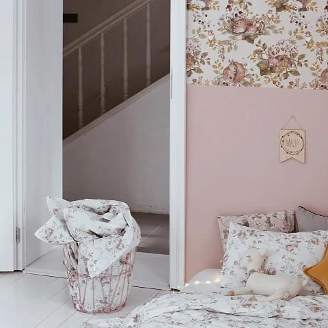 Wąskie pasy tapety gwarantują to, że tapetę dopasujemy prawie idealnie do szerokości ściany. A zapętlony wzór – każdy z pasów wygląda identycznie – sprawia, że elementy wzoru idealnie układają się na ścianie, jeśli kleimy tapetę od sufitu (oczywiście na ścianie bez skosów :). Dzięki temu nadwyżek materiału jest naprawdę niewiele.