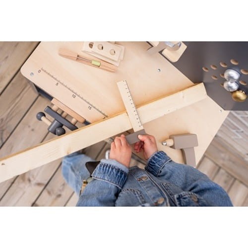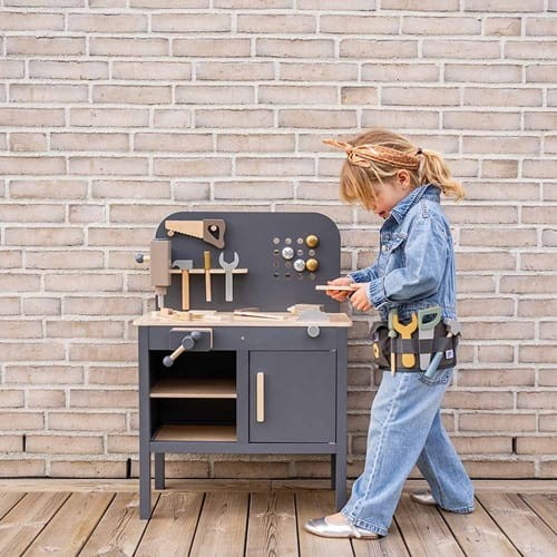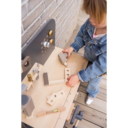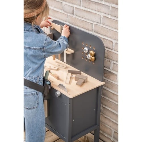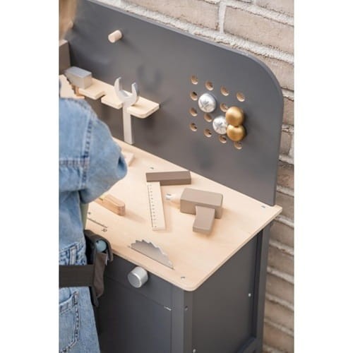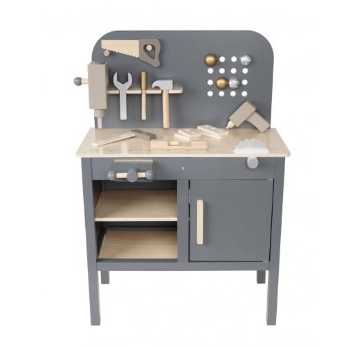 Drewniany warsztat dla małych majsterkowiczów od Jabadabado. W pięknej, "męskiej" kolorystyce grafitu w połączeniu z elementami w kolorze naturalnego drewna. Idealny dla maluszków, którzy lubią naśladować tatę podczas prac remontowych i pracy z narzędziami.