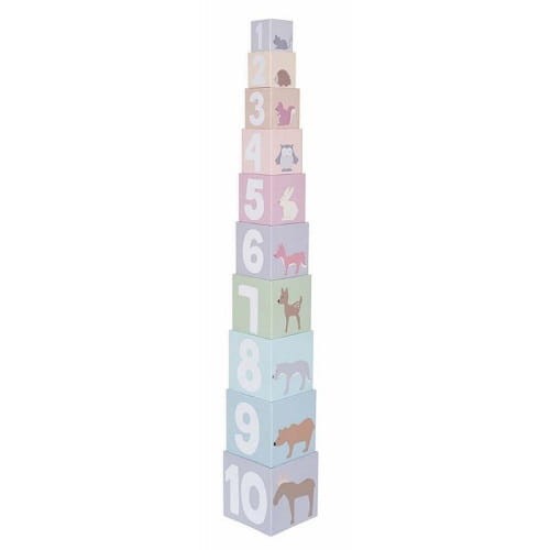Urocza wieża piramidka LAS z wizerunkiem leśnych zwierzątek , w pięknej pastelowej kolorystyce zachwyci każdego maluszka. Wieża składa się z 10 kolorowych kostek wykonanych z wysokiej jakości kartonu. Doskonale nadaje się już dla rocznego dziecka, któremu zarówno budowa wieży, jak i jej przewracanie sprawi dużo radości! Zabawka wspiera rozwój umiejętności motorycznych i koordynacji u dziecka. To prosty, zabawny i edukacyjny sposób do nauki liczenia.