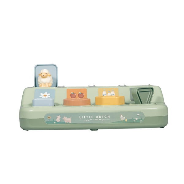 Zabawka pop-up Little Farm od Little Dutch. Promuj wyobraźnię, kreatywność i zdolności motoryczne swojego dziecka dzięki tej wciągającej zabawce Little Dutch. Przez zabawę trenuj rozpoznawanie kolorów i kształtów. Naciśnij lub obróć przyciski, a pojawi się małe zwierzątko z Little Farm. Zabawka zapakowana w ładne kartonowe opakowanie, sprawdzi się jako doskonały pomysł na prezent.