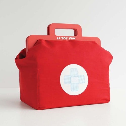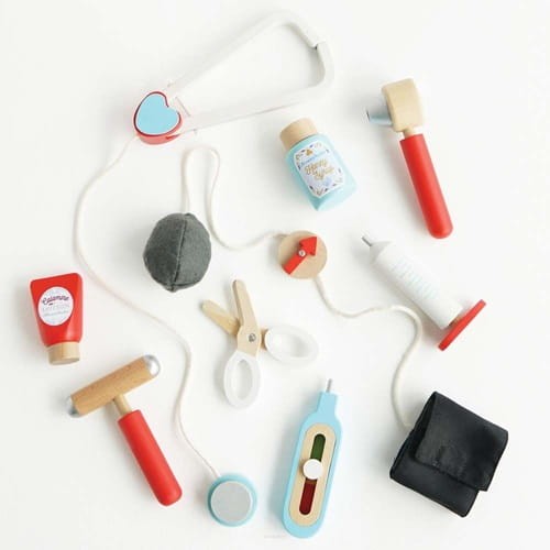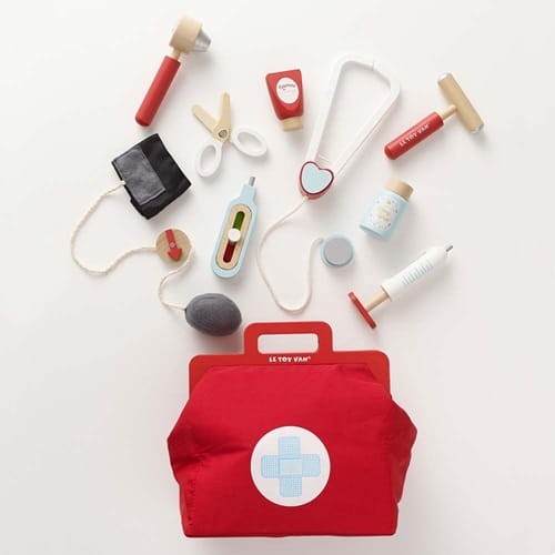 Zestaw lekarza Le Toy Van składa się z torby lekarskiej z tkaniny w stylu vintage z dnem ze sklejki i 9 drewnianych akcesoriów. Akcesoria mają unikalne funkcje do odkrycia, w tym stetoskop, odkręcaną nakrętkę syropu i ciśnieniomierz na rzep. Wszystkie akcesoria wykonane są z litego drewna i sklejki FSC, z naturalnym bawełnianym sznurkiem na stetoskopie i ciśnieniomierzu