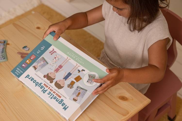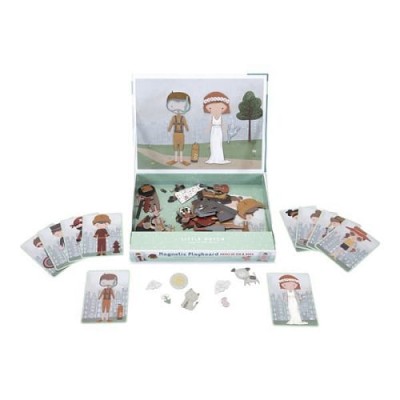 Zestaw magnesów Rosa & Jim od Little Dutch. Zestaw składa się z 80 małych magnesów, 6 kart dla Rosy i 6 dla Jima. Wewnątrz kartonu na wewnętrznej stronie kartoniku znajduje się magnetyczna pokrywa do której dziecko przyczepia magnesy.