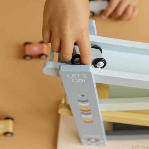 Drewniana zjeżdżalnia dla autek w kolorze niebieskim. Marka Little Dutch.