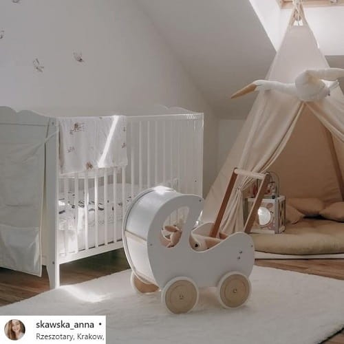 Przedmiotem sprzedaży jest drewniany wózek dla lalek bez pościeli. Pościel jest dostępna osobno. Kolory i wzory pościeli są dostępne TUTAJ Do wózka w kolorze białym z elementami naturalnego drewna najbardziej polecamy pościel szarą w białe gwiazdki z naszej oferty.