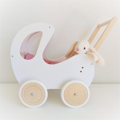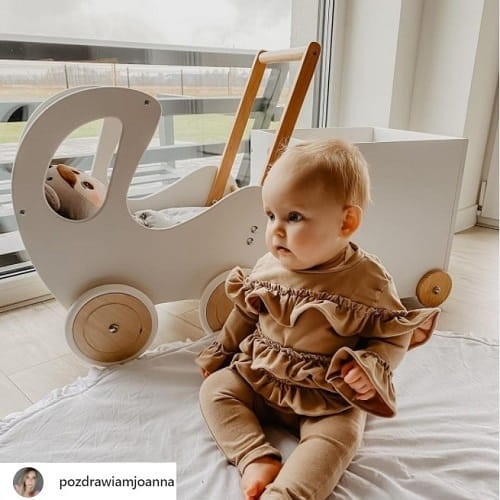 Drewniany wózek dla lalek jest dostępny również w kolorze białym, miętowym oraz różowym.