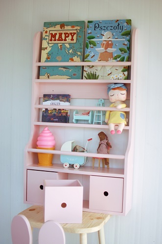 Duża półka ścienna z 3 szufladkami w formie pojemnych skrzyneczek, w których można przechowywać swoje skarby. Skrzyneczki posiadają po środku otworki, które służą do otwierania. Zarówno cała półka jak i każda ze skrzynek może być pomalowana na dowolny kolor, dzięki czemu można dopasować półkę do kolorystyki pokoju dziecka.