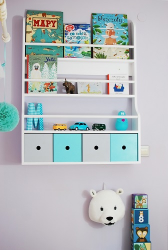 Półka ścienna Kameleon pełni rolę pojemnej biblioteczki. Dodatkowo zawiera 4 szufladki - skrzyneczki, które pomieszczą duże ilości drobiazgów. Do otwierania służą otworki wykonane po środku skrzyneczki. Jeśli ułożysz skrzyneczki jedna na drugą stworzysz dodatkowy regalik. Zarówno cała półka jak i każda ze skrzynek może być pomalowana na dowolny kolor, dzięki czemu można dopasować półkę do kolorystyki pokoju dziecka.