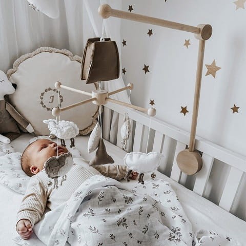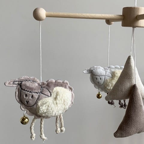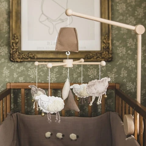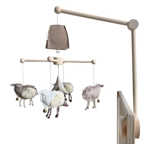 Karuzela do łóżeczka z poztywką"Owieczki" została wykonana z wysokogatunkowego drewna. Posiada obrotową pozytywkę ukrytą pod “kapturkiem” z filcu. Po nakręceniu zabawki - miękkie owieczki delikatnie się obracają.