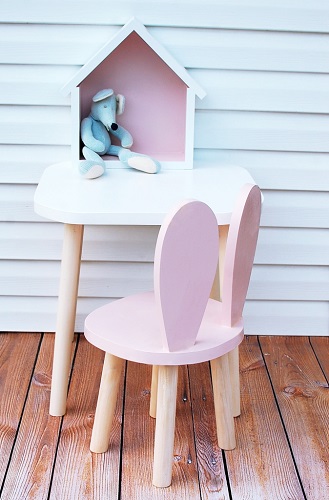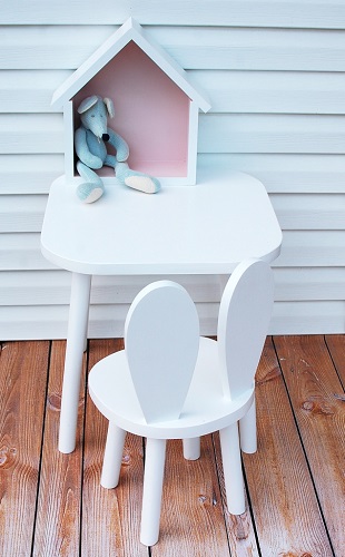 Uroczy zestaw mebelków do pokoju dziecięcego. Komplet zawiera drewniany stolik i krzesełko Króliczek dla dzieci. Mebelki wykonane są w całości z drewna sosnowego. Malowane specjalnymi, atestowanymi farbami, przez co są bezpieczne dla maluchów. Odpowiadają normom i standardom mebli dla dzieci.