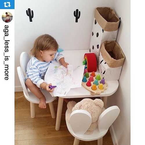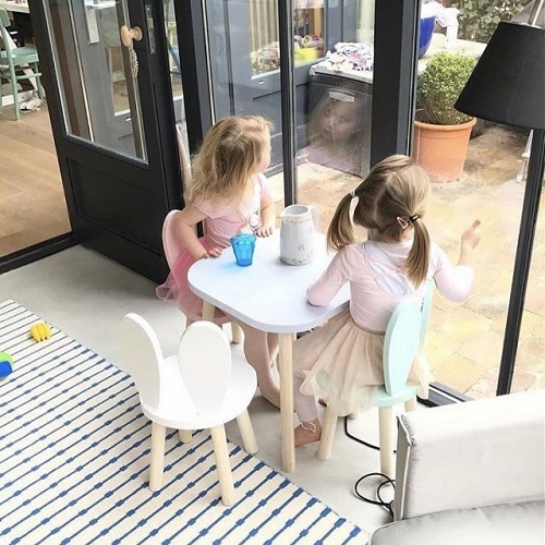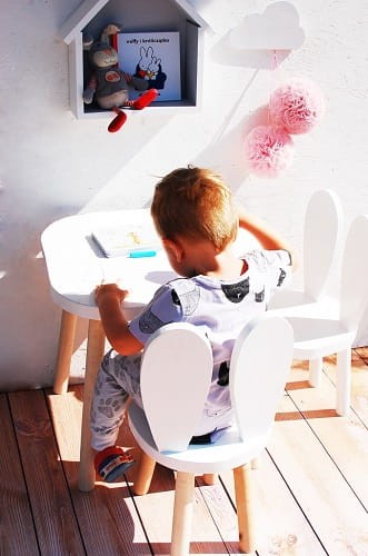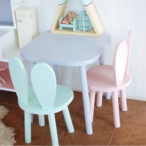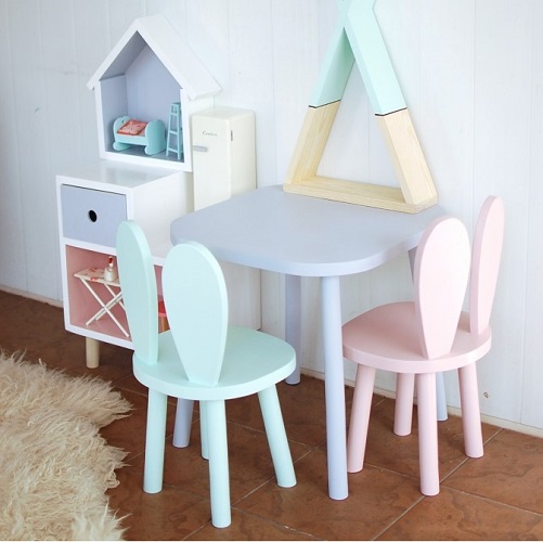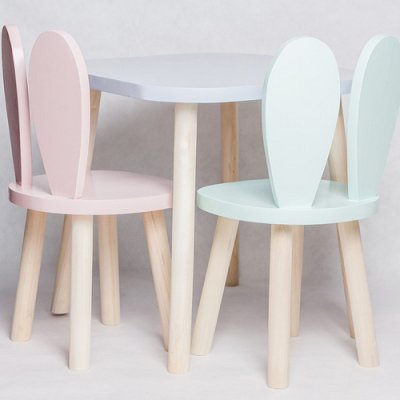 Czy to krzesełko dziecięce czy to króliczek? Poznaj uroczy komplet zawierający drewniany stolik z krzesełkami dla dzieci. Co je wyróżnia? Królicze uszka i kolory - zarówno te pastelowe, jak i bardziej wyraziste - które doskonale podkreślają charakter dziecięcego pokoju.